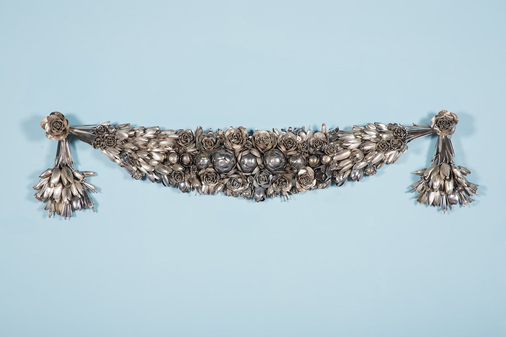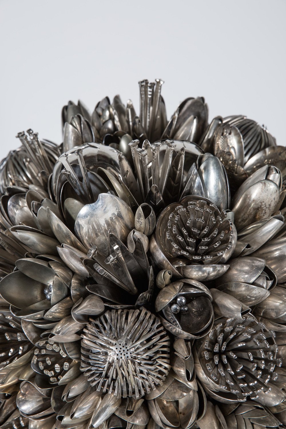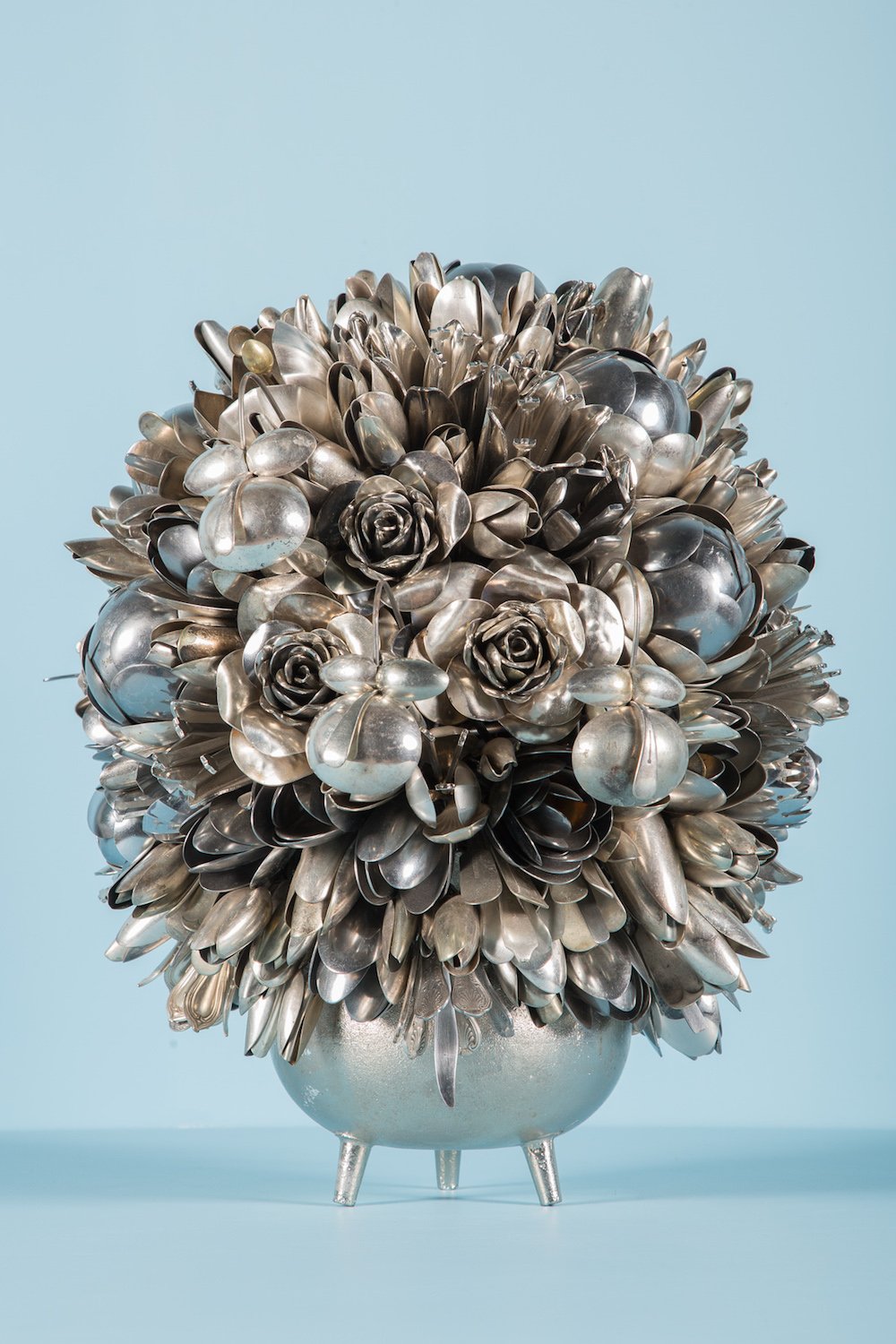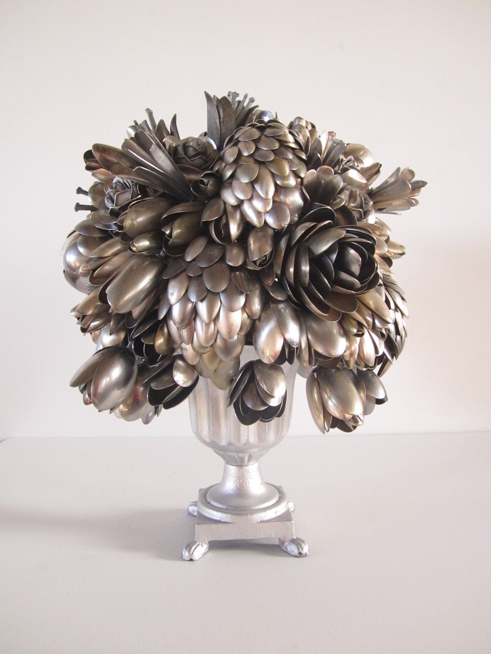 Reparou o detalhe da foto acima? São vários talheres formando o arranjo! Fico muito impressionada como algumas pessoas são habilidosas e criativas. Foi exatamente isso que pensei quando vi esse trabalho da artista britânica Ann Carrington. São esculturas feitas com garfos, facas e colheres! Sim… ela dobra, cola e retorce os mais simples talheres e transforma tudo em criativos bouquets de “flores”… dizem que são tão perfeitos que parecem até flores de verdade mergulhada numa tinta prata!